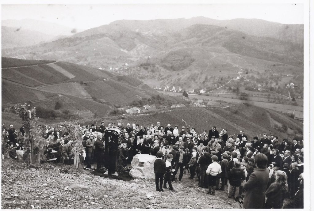 Noch bis zum Jahre 1967 bedeckte ein damals lockerer Mischwald aus Eichen, Buchen und Kastanien den heutigen „Urbansberg“. Auf der dem „Binzenloch“ zugewandten Seite klaffte eine große Lücke, in welcher Bergsand und Steine für den Wegebau gebrochen wurden. Auf der Suche nach geeignetem Rebland traten fünf Winzer an den Gemeinderat heran. Die Erinnerungstafel am Bildstock gibt Zeugnis von dieser Urbarmachung, mit der dem ehemaligen, von Ebersweier bis Nussbach reichenden großen „Hardtwald“ ein weiteres Stück entrissen wurde.